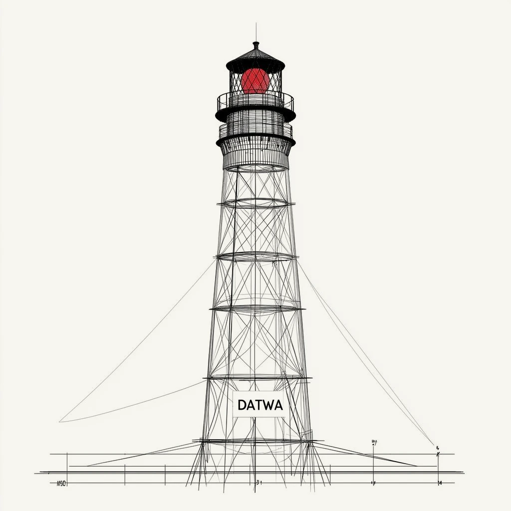 A lighthouse rendered as angular wireframe architecture. Vertical tower built from precise intersecting black lines with structural bracing bands.