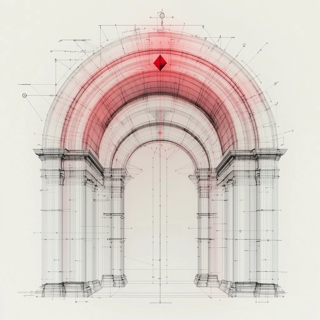 Architectural bracing drawn as speculative linework. Every stress point annotated. The arch as structural poem.