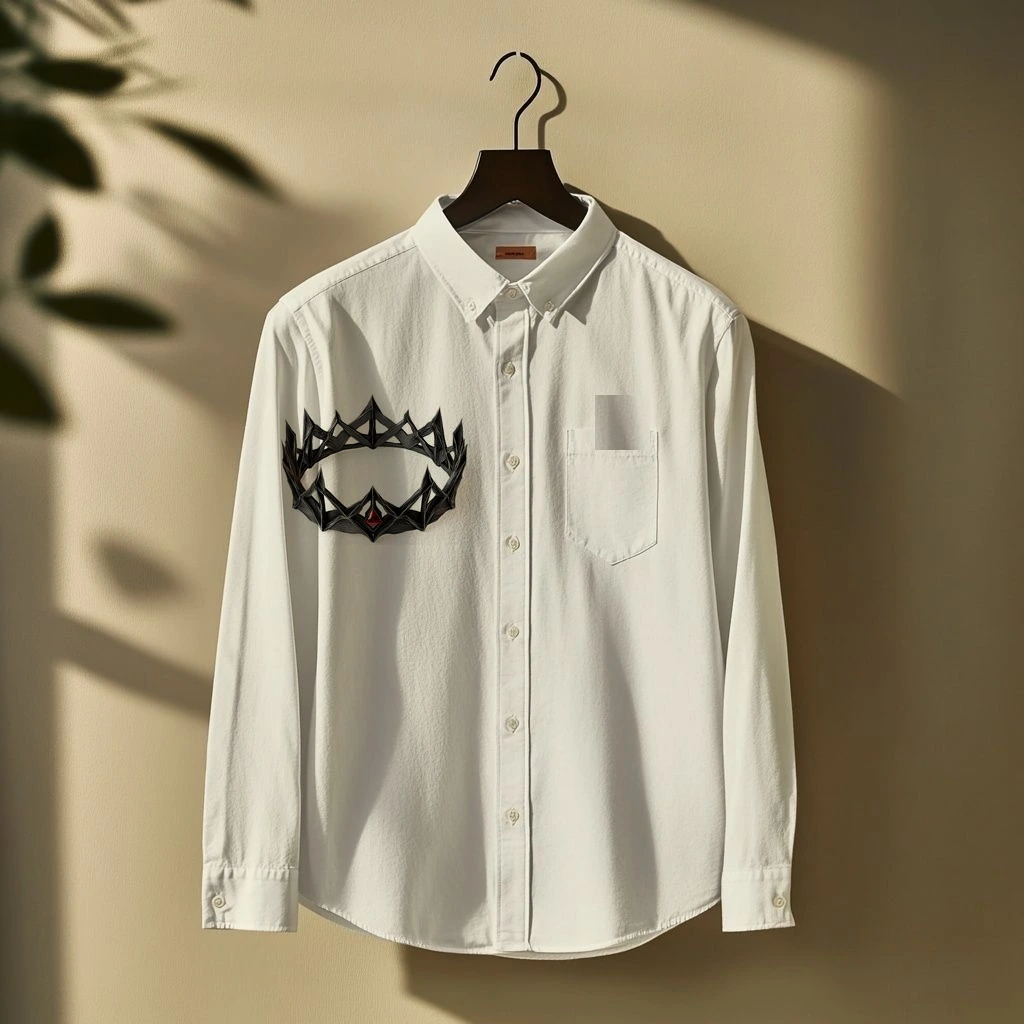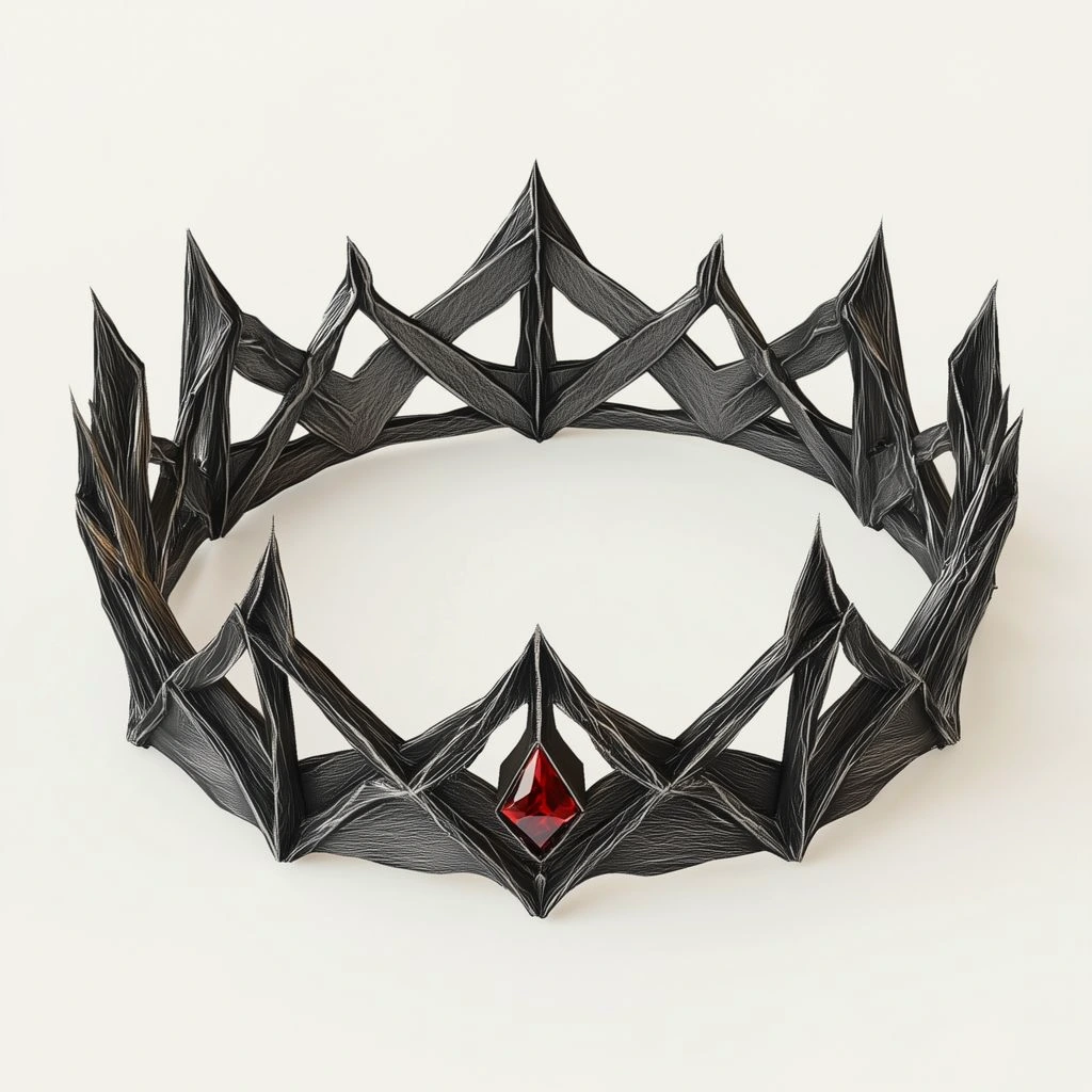 An iron crown rendered as angular wireframe. Hammered band with angular peaks and structural cross-members in precise black lines.