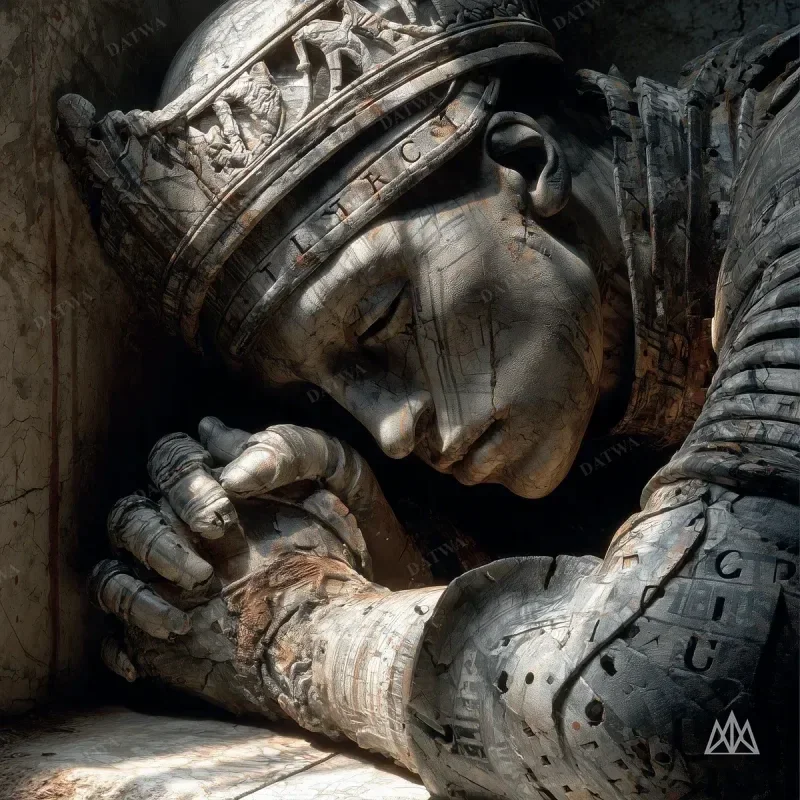 A stone knight effigy lying on a tomb in a cathedral crypt. Candlelight casting dramatic shadows across carved armor. Caravaggio meets medieval sculpture.