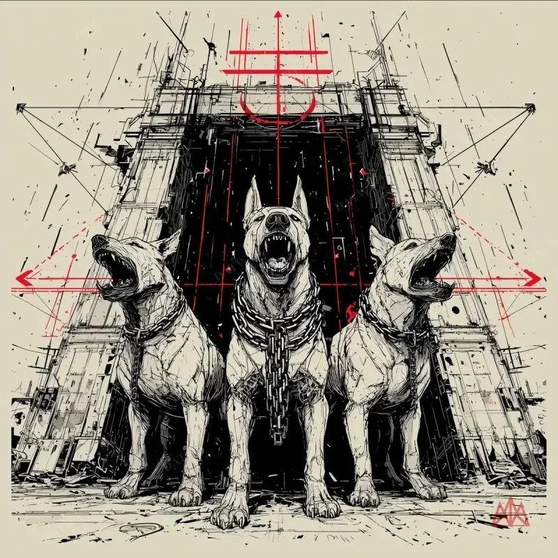 All three heads exploded into comparative anatomical cross-sections. Gate mapped as structural fortification engineering. Chains as tensile cable systems with load ratings.