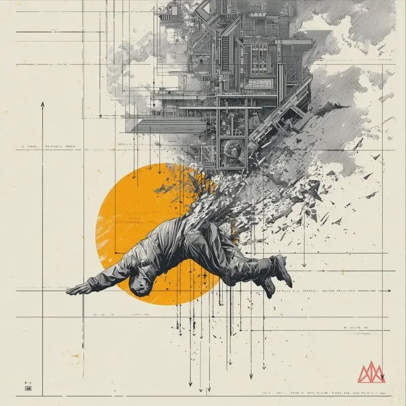 Disintegrating wings as structural failure diagrams with stress fracture annotations. Feathers mapped as individual load-bearing elements failing in sequence.