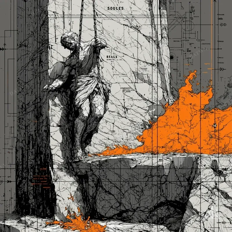 Prometheus chained to a mountain rock. Eagle descending toward exposed torso. Fire burning in outstretched hand despite punishment. Caravaggio lighting from the flame.