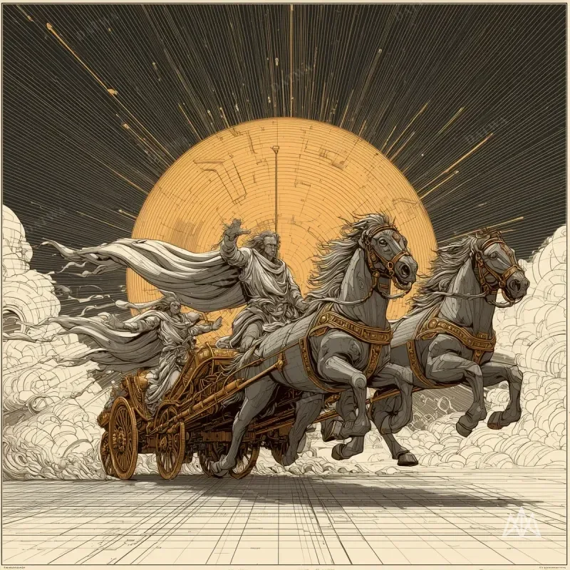 Helios driving his golden chariot across the sky. Four horses of fire pulling the sun. Robes streaming with solar wind. Seen from below into blinding radiance.