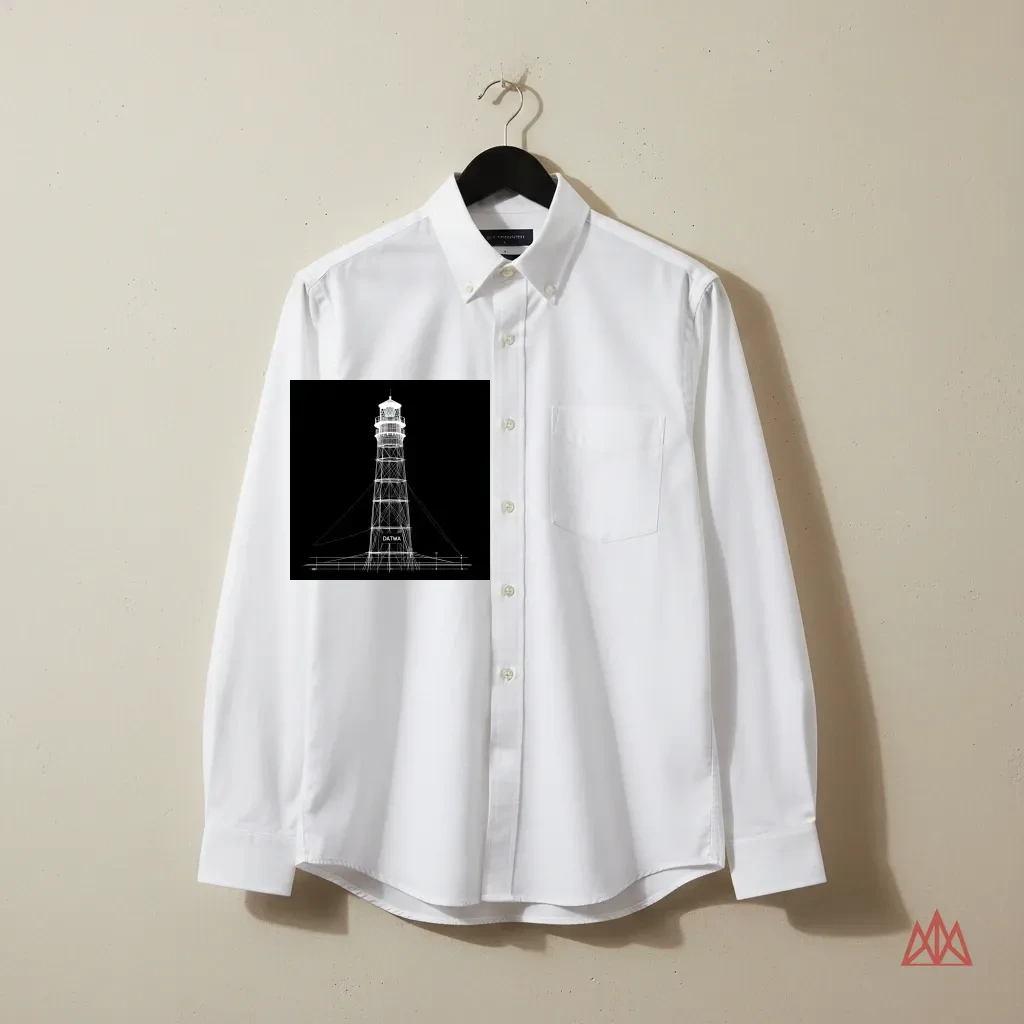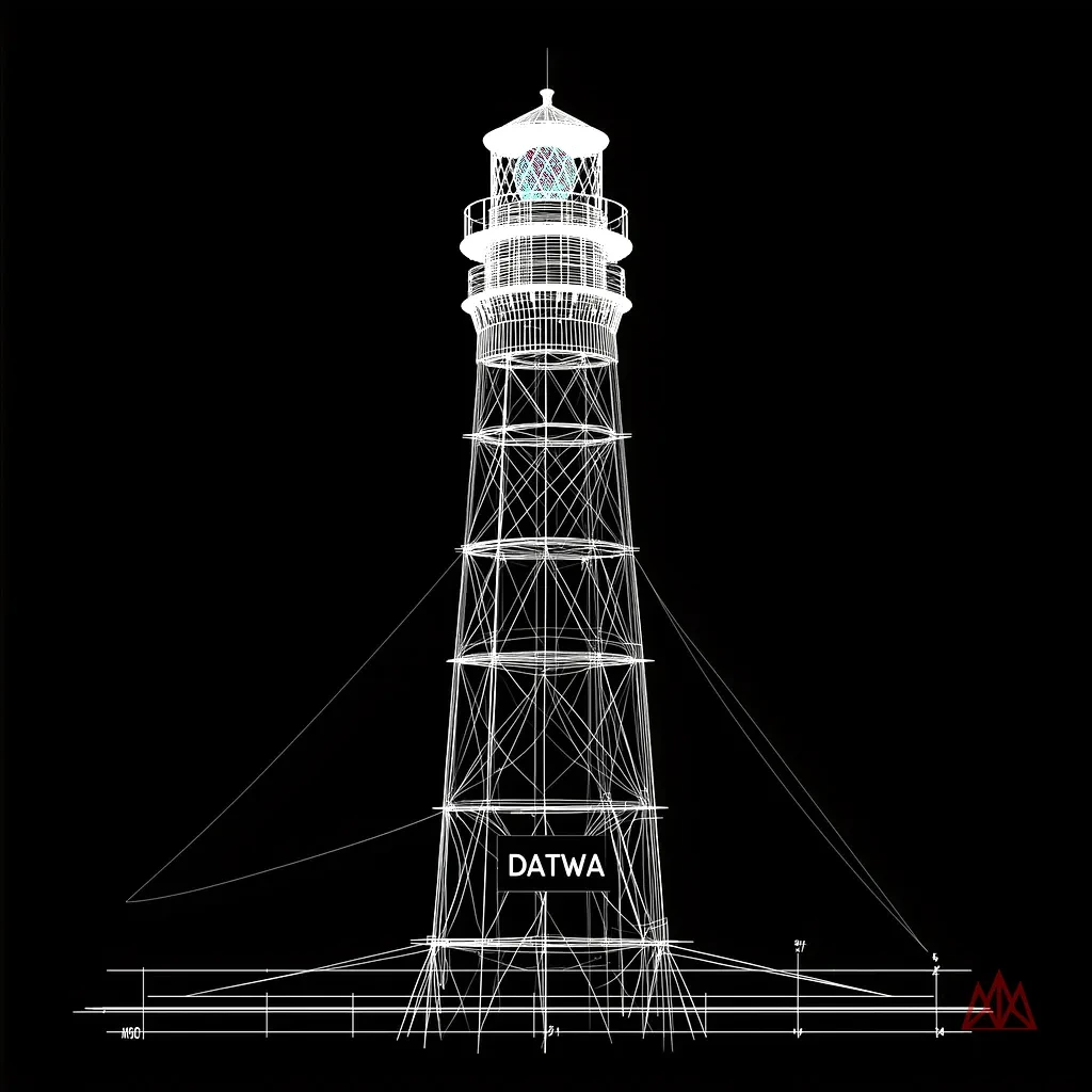 A lighthouse rendered as angular wireframe architecture. Vertical tower built from precise intersecting black lines with structural bracing bands.
