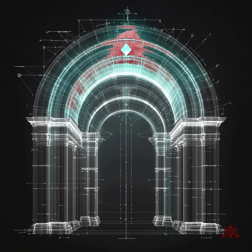 Architectural bracing drawn as speculative linework. Every stress point annotated. The arch as structural poem.