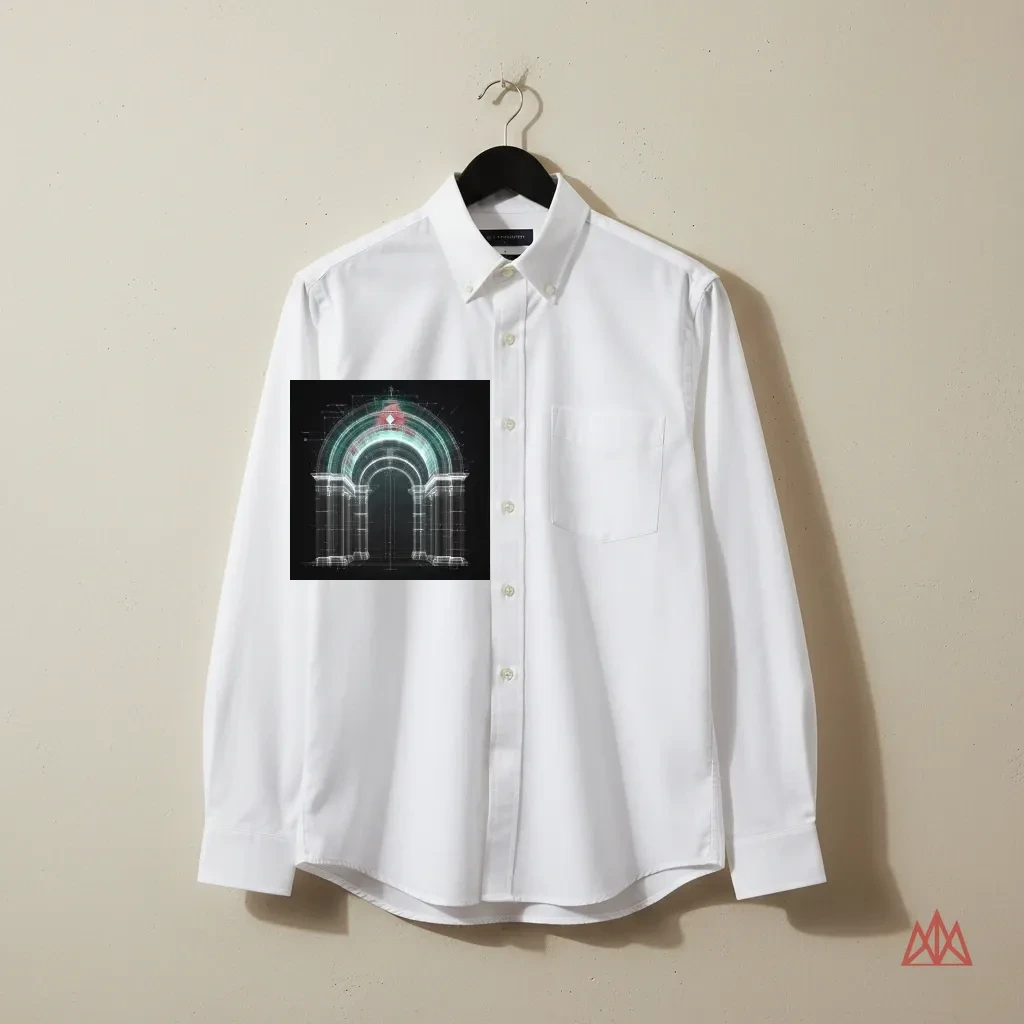 A Gothic cathedral arch rendered as angular wireframe. Pointed arch with flying buttress supports in precise black lines.