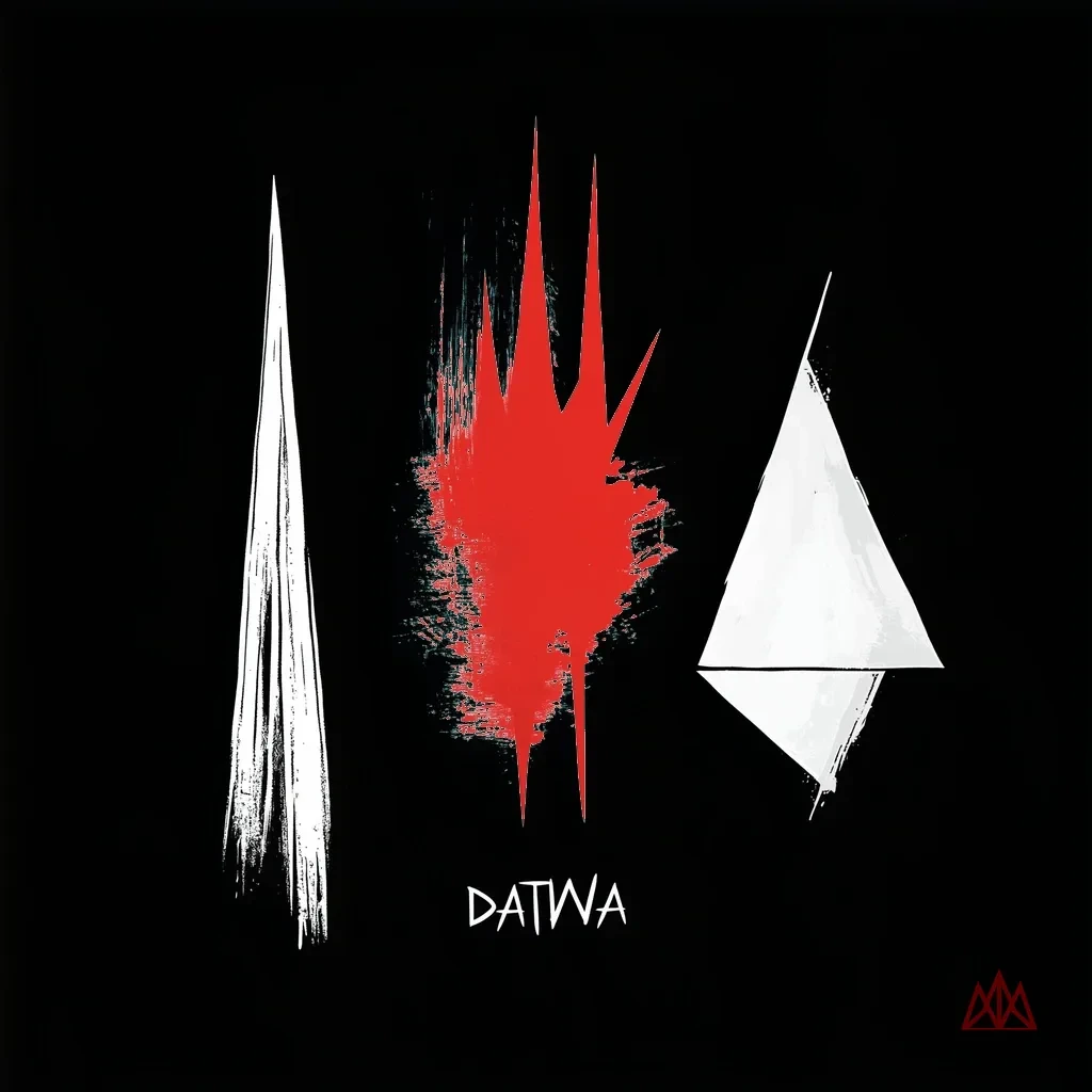 Single red brushstroke crown in the center — the only color. DATWA beneath in tracked architectural type. The mark beneath the mark.